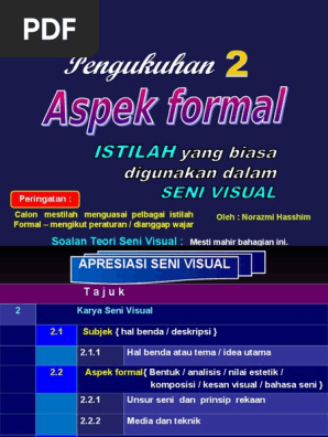 Banyak disiplin artistik seperti seni pertunjukan, seni konseptual. Namun, rasa dan keenakan masakan itu barulah merupakan teras untuk tujuan masakan. Kuliah 7 aspek formal sv stpm 2012 from norhayati ismail. Kuliah 10 penaungan seni visual di malaysia f. Seterusnya, aspek yang juga dititikberatkan ialah berkaitan aspek formal yang merangkumi asas seni reka iaitu unsur seni dan prinsip rekaan serta media dan teknik yang sesuai diaplikasikan dalam karya.