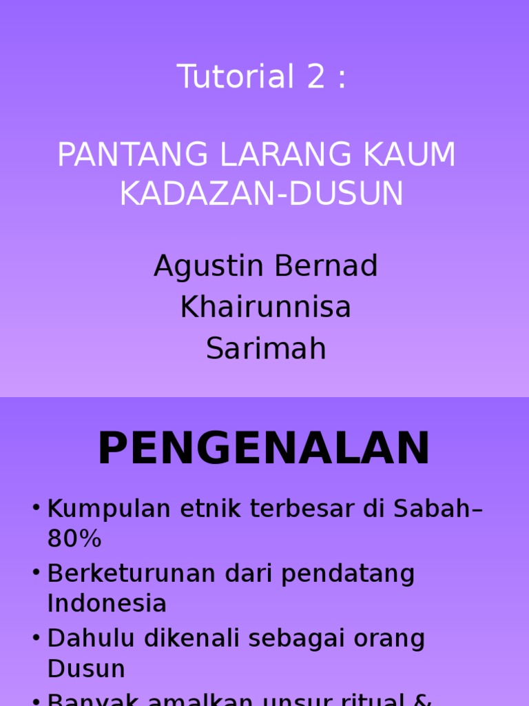 Folio Kadazan Docx Document from cdn.vdokumen.net Di daerah penampang yang bukan di pesisir pantai dan daerah tambunan di pedalaman. B) sehari sebelum majlis perkahwinan diadakan bakal pengantin tidak dibenarkan keluar daripada rumah. Pantang larang kaum melayu, cina dan india. • sejak lahir hingga tamat tempoh pantang ibu anak yg baru lahir diberi kawalan secara mistik oleh bidan agar tidak diganggu. Adat berkabung kaum kadazandusun pesisir pantai seperti di papar adalah sama seperti mereka yang tinggal di pedalaman, namun mereka mempunyai pengaruh budaya luar seperti adat masyakarat cina. Pantang larang kaum melayu, cina dan india. Kaum kadazandusun atau bangsa dusun merupakan nama kaum bumiputera asli yang terbesar di sabah. Selepas dimandikan dan seluruh badan dilap , mayat tersebut.
